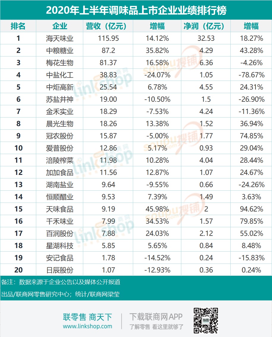 2020年上半年,從營收、凈利增速方面來看,基礎(chǔ)調(diào)味品上市企業(yè)表現(xiàn)也不俗。20家企業(yè)中,中糧糖業(yè)營業(yè)收入87.2億元位居第二位;梅花生物營業(yè)收入87.2億元位居第三位;中鹽化工營業(yè)收入38.83億元位居第四位。
