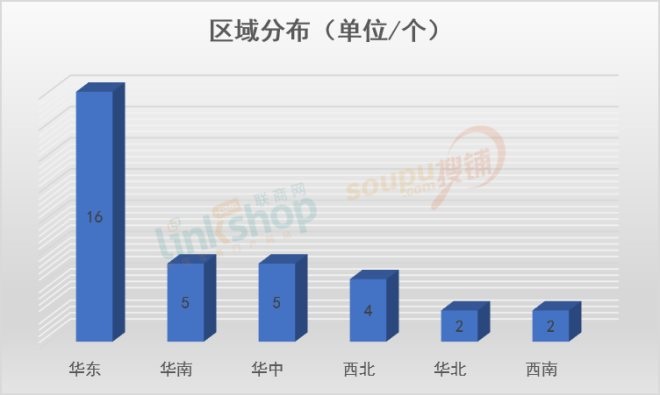 區(qū)域上看,華東繼續(xù)穩(wěn)固自己的榜首地位,16個(gè)開業(yè)量領(lǐng)先其他六大區(qū),開業(yè)量接近一半;華中和華南地區(qū)以5個(gè)開業(yè)量并列次席;西北以4個(gè)開業(yè)量緊隨其后,華北和西南各有2個(gè)項(xiàng)目開業(yè),而東北則無項(xiàng)目入市。