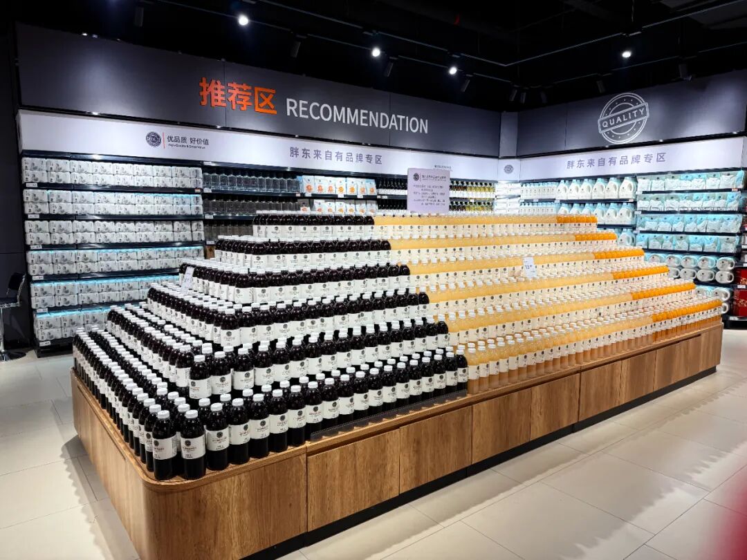 調(diào)改后,各店商品力顯著提升,新品引入比例普遍達(dá)到45%以上,商品結(jié)構(gòu)已接近胖東來標(biāo)準(zhǔn)的80%。店內(nèi)均設(shè)有醒目的“胖東來自有品牌專區(qū)”與“品質(zhì)永輝”系列矩陣,讓DL果汁、精釀啤酒等網(wǎng)紅商品及永輝高質(zhì)價(jià)比自有品牌產(chǎn)品觸手可及。生鮮板塊強(qiáng)化了精品與體驗(yàn)屬性,智利車?yán)遄印⒓t顏草莓、丹東草莓等冬季時(shí)令尖貨依托永輝直采供應(yīng)鏈新鮮直達(dá)。服務(wù)層面,拓寬的通道、降低的貨架、配備血壓儀等設(shè)施的休息區(qū)、以及肉禽海鮮免費(fèi)加工等細(xì)節(jié),無不體現(xiàn)著以人為本的服務(wù)溫度。