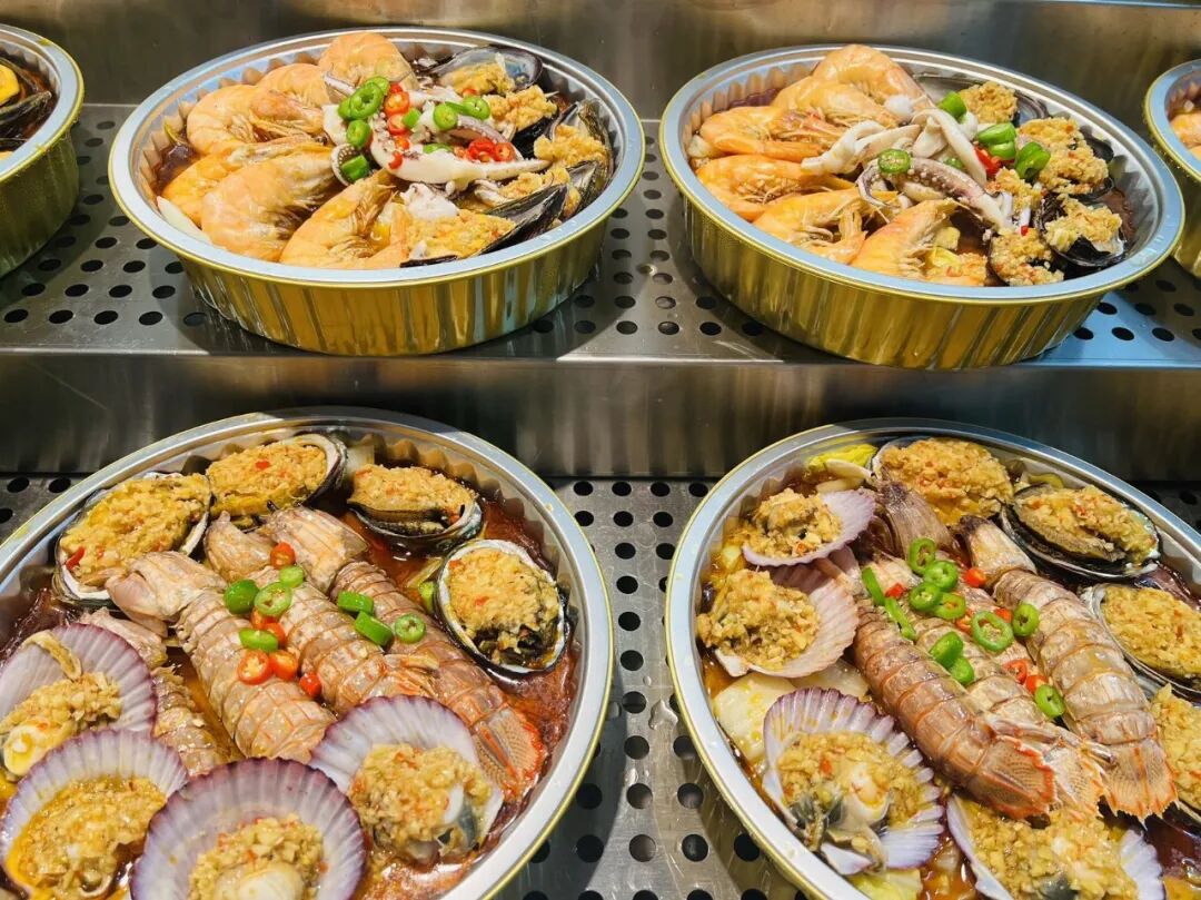 尤為值得關(guān)注的是永輝在海鮮消費場景上所做的創(chuàng)新體驗?,F(xiàn)場制售的“海鮮家庭分享桶”與“元氣蒸”項目形成了巧妙的風(fēng)味互補。一邊是現(xiàn)場加工、熱辣馥郁的分享大菜,選用波士頓龍蝦、小青龍等鮮活食材;另一邊則是即時蒸煮、鎖住原味的貝類與蝦蟹,主打食材的本真鮮甜。這種“現(xiàn)制熱出、即選即享”的模式,將后廚的鍋氣與煙火感直接傳遞至賣場,讓海鮮消費從靜態(tài)選購轉(zhuǎn)變?yōu)閯討B(tài)體驗,為家庭餐桌提供了一個新鮮、熱鬧且充滿儀式感的選擇。